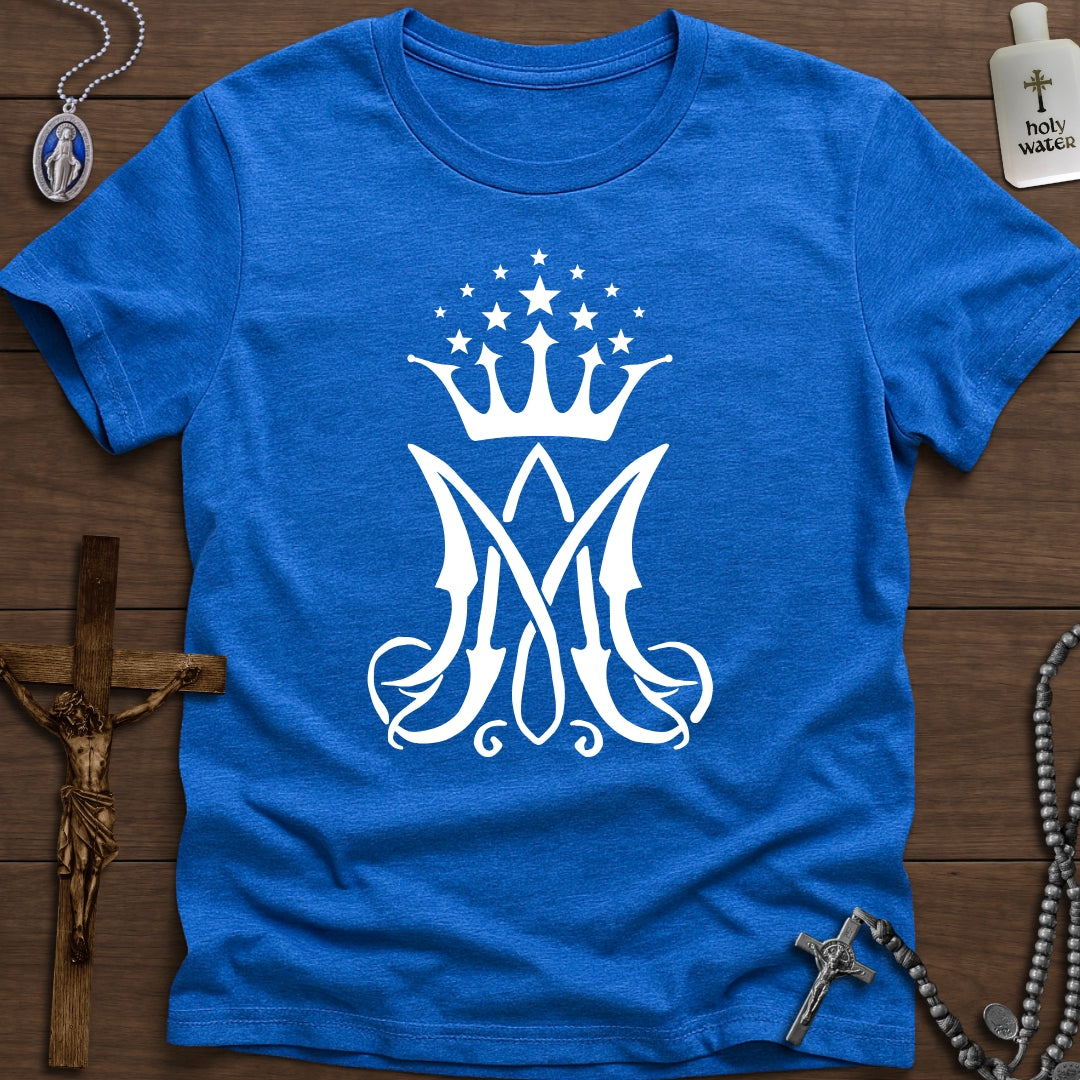 The Auspice Maria T-shirt features a unique monogram design with intersecting letters 'A' and 'M'. Auspice Maria in English means 'Under the Protection of Mary'.