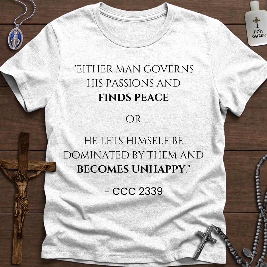 Featuring a powerful quote from the Catholic catechism (2339), this T-shirt reminds us that governing our own passions leads to a fulfilled life. Join the movement towards true human freedom and express your faith with this stylish tee.