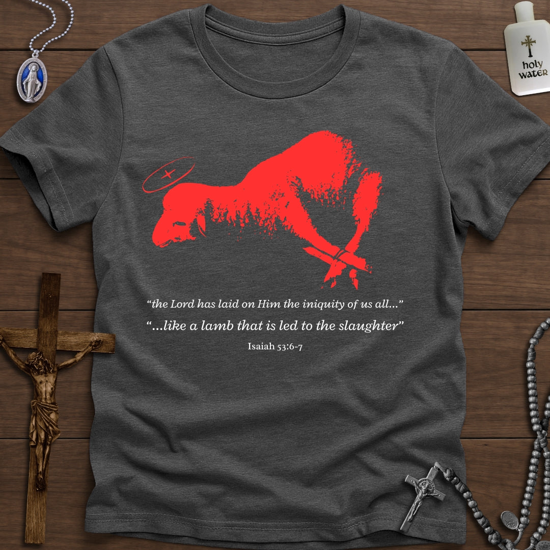This iconic t-shirt features a classic art piece, Agnus Dei by Francisco de Zurbarán, depicting a tied lamb being 'led to the slaughter'. The powerful imagery is complemented with text from Isaiah 53:6-7, making it a perfect conversation starter for those interested in art and biblical references.