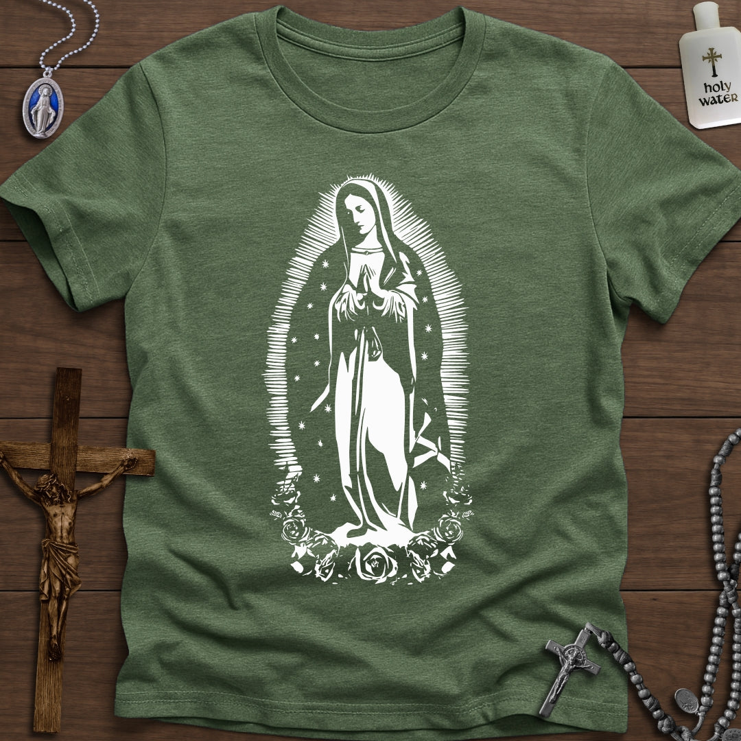 Show your devotion to Our Lady of Guadalupe with this t-shirt. Featuring a beautiful depiction based on the original Tilma, this shirt is perfect for any Catholic looking to express their faith.