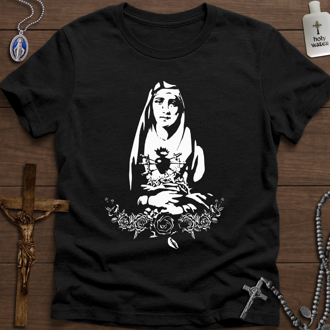 Show your devotion to the Virgin Mary with this soft and comfortable t-shirt that features an iconic image of Our Lady of Sorrows.