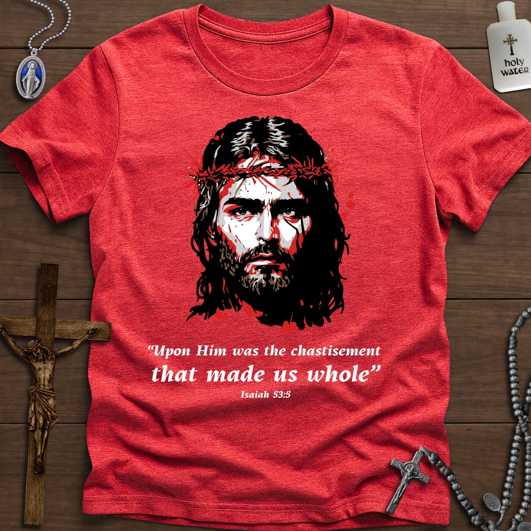 Proclaim your faith with this Catholic t-shirt featuring a powerful message: 'Upon Him was the Chastisement that Made Us Whole.' With an image of Our Lord wearing a crown of thorns, this shirt serves as a reminder of His sacrifice and love for us.
