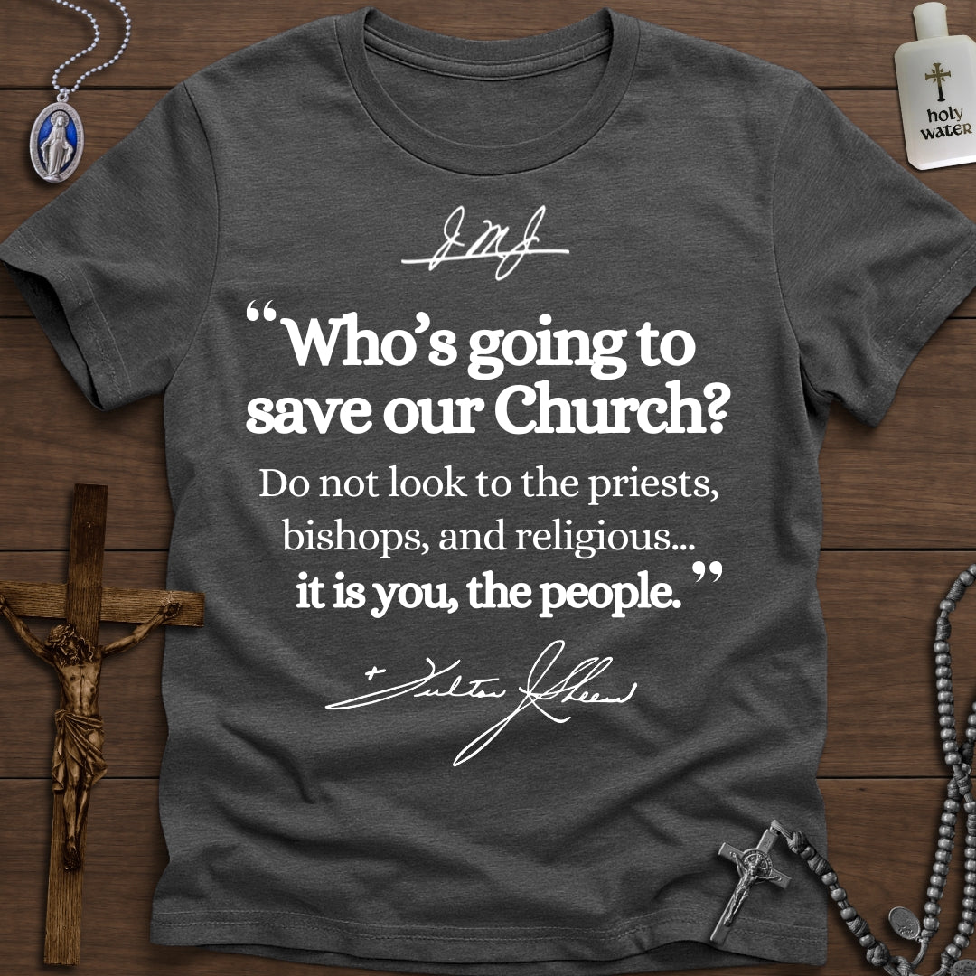 Wear your faith with conviction. This t-shirt, featuring Archbishop Fulton Sheen's powerful words, 'Who is going to save our church? Do not look to the priests...it is you, the people,' serves as a daily reminder of the laity's vital role.